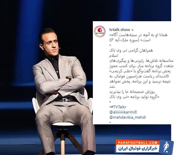 سازندگان برنامه اینترنتی تی وی تاک در پستی اینستاگرامی اعلام کردند که با وجود رایزنی های بسیار زیاد برنامه علی کریمی پخش نخواهد شد.
